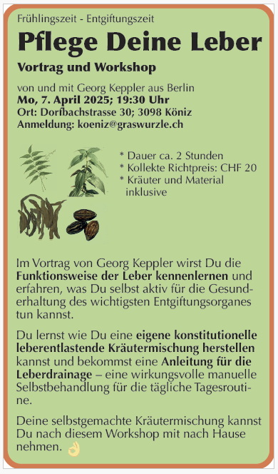 Im Vortrag von Georg Keppler wirst Du die Funktionsweise der Leber kennenlernen und erfahren, was Du selbst aktiv für die Gesunderhaltung des wichtigsten Entgiftungsorganes tun kannst.